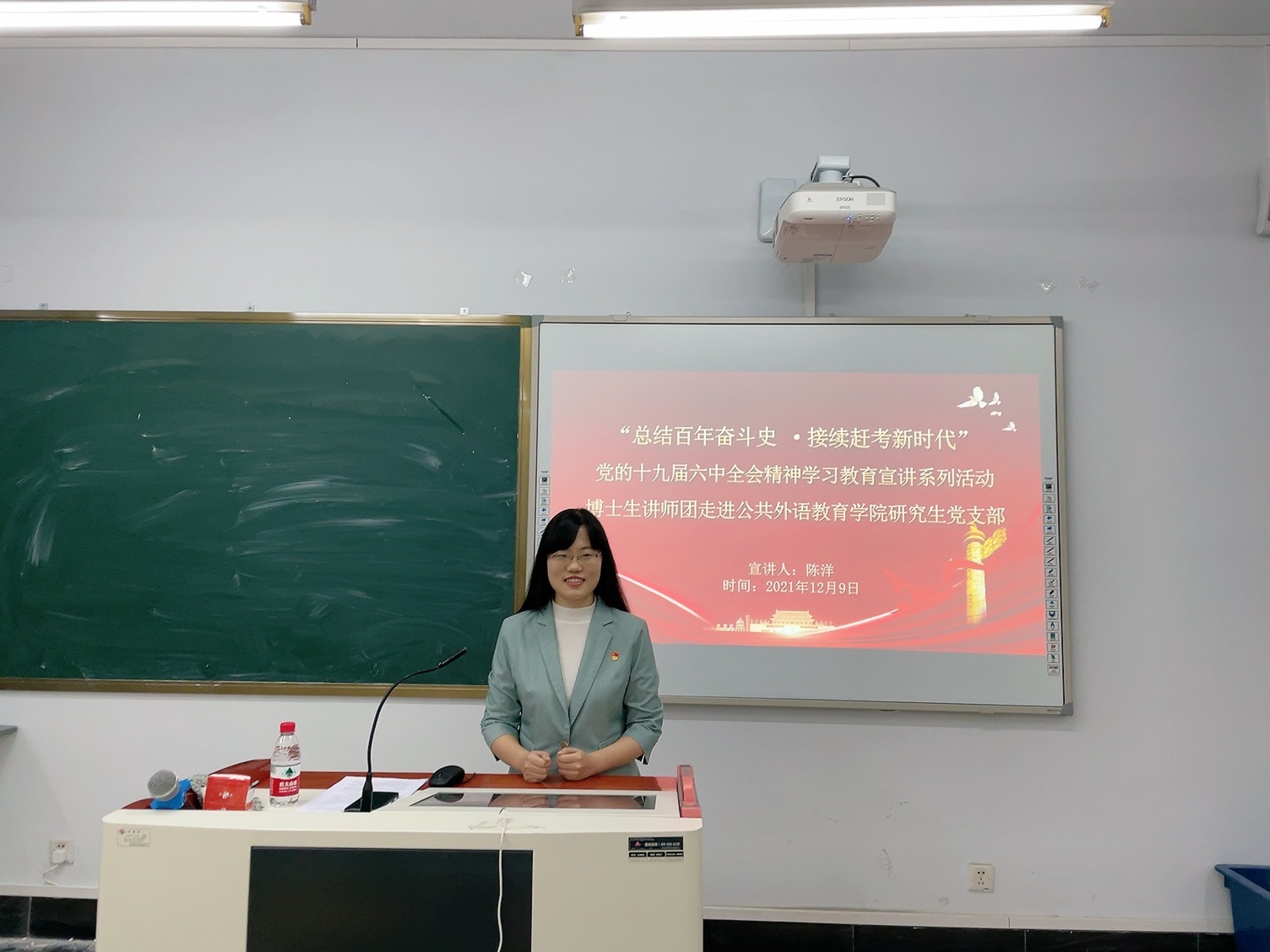 为深入学习贯彻党的十九届六中全会精神,提升广大研究生思想素质,积极响应校党委研究生工作部工作要求,2021年12月9日,公共外语教育学院邀请吉林大学博士生讲师团讲师陈洋博士于经信楼D401进行了十九届六中全会精神学习教育宣讲。本次宣讲的主题为“总结百年奋斗史•连续赶考新时代”——从党的百年奋斗史中汲取前进力量。此次宣讲由曾媛老师主持,公共外语教育学院研究生党支部党员、预备党员、研究生会成员、助管及其他学生代表参与了此次宣讲活动。