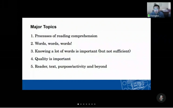 hang Dongbo教授是国际二语阅读和词汇习得领域的专家,他系列讲座题目的是:“Lexical Basis of Second Language Reading Comprehension: From Vocabulary Size and Depth to Processing Efficiency”。在讲座中,首先概括性地介绍了二语阅读的认知过程,进而阐明无论是对于书写加工、词汇提取、还是意义激活,词汇识别都是二语者进行阅读活动的前提。词汇识别不仅要求阅读者把词汇融入在线的语境,还要求阅读者选择与特定语境相匹配的词汇语义。欲使阅读流畅高效,词汇识别就要实现自动化。接下来,他阐述了二语词汇知识的多维度性,包括词汇形式、意义、使用的三位一体模式以及词汇知识广度和深度的二分特征。在此基础上,他结合该领域最近几年的研究成果,指出尽管词汇量(即词汇知识广度)与阅读能力直接相关,但是仅有词汇量是不够的,词汇深度知识(包括词汇的多义性、词块、形态变化、词义联系的网络化程度等因素)对于阅读更加重要。最后他还指出,二语阅读者的个体差异、阅读文本的差异以及阅读目的的差异也会影响二语者对于词汇的识别和加工。因此,鉴于词汇知识的多维度性,二语者在阅读过程中要逐渐学会根据不同的文本类型、阅读任务等语境因素灵活地调取词汇资源。