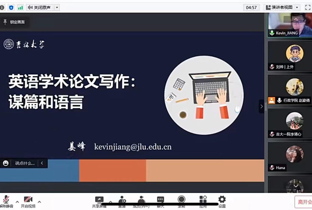 2022年4月20日晚6:30,由吉林大学党委研究生工作部主办,公共外语教育学院协办的爱“语”你我,同“疫”课堂——吉林大学研究生线上外语系列课程第一课开讲。第一课的主题为“学术英语论文写作:谋篇和语言”,由公共外语教育学院副院长、匡亚明特聘教授姜峰老师主讲,校内外研究生踊跃参与。