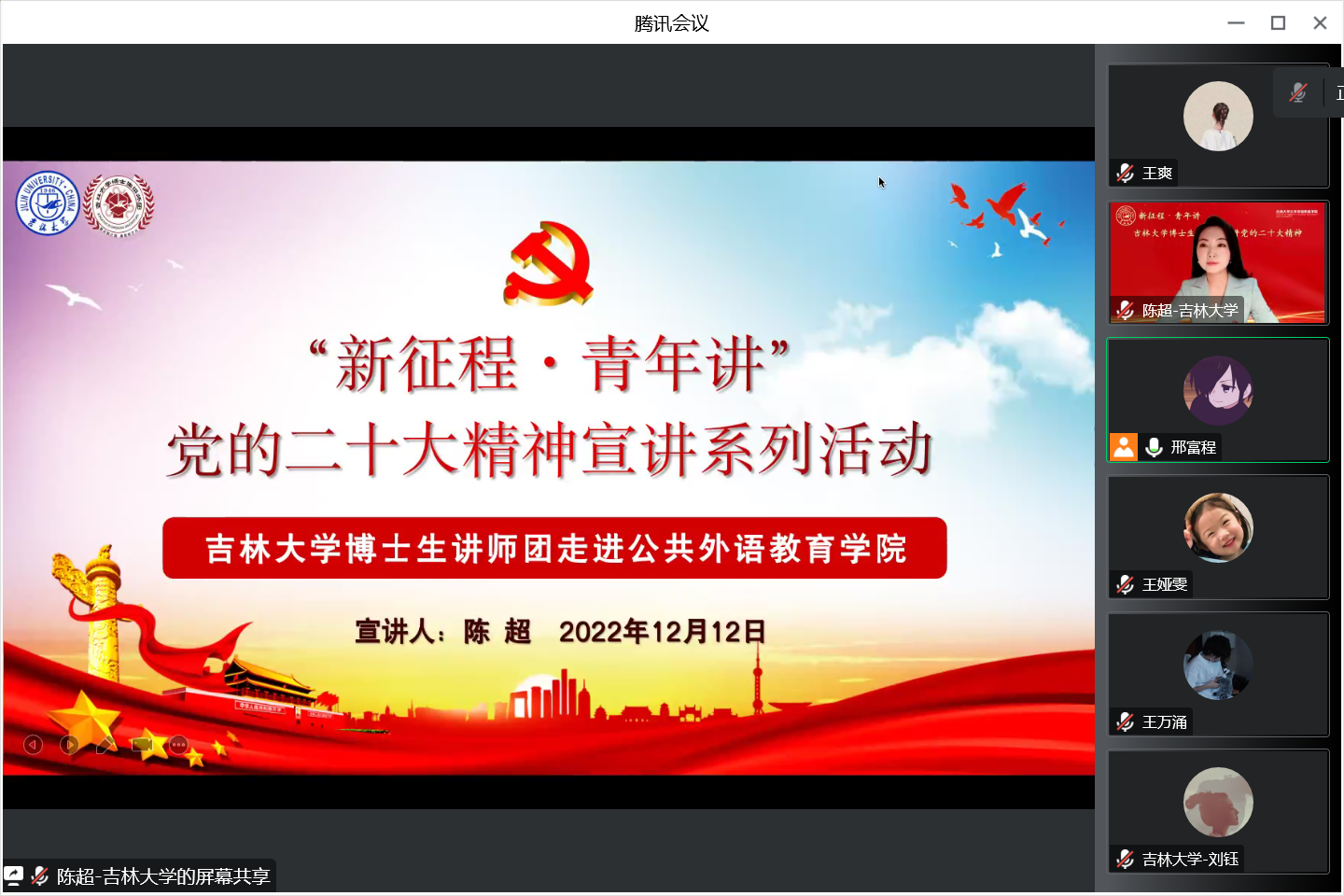 为深入学习贯彻党的二十大精神, 用党的科学理论武装青年,用党的初心使命感召青年,强化爱国爱党意识,2022年12月12日晚,博士生讲师团走进我院研究生三个党支部进行宣讲。本次宣讲由吉林大学博士生讲师团陈超博士主讲,宣讲主题为“增进民生福祉 提高人民生活品质”;宣讲由研会邢富程同学主持, 辅导员曾媛老师列席会议,研究生党支部全体党员参与了此次宣讲活动。