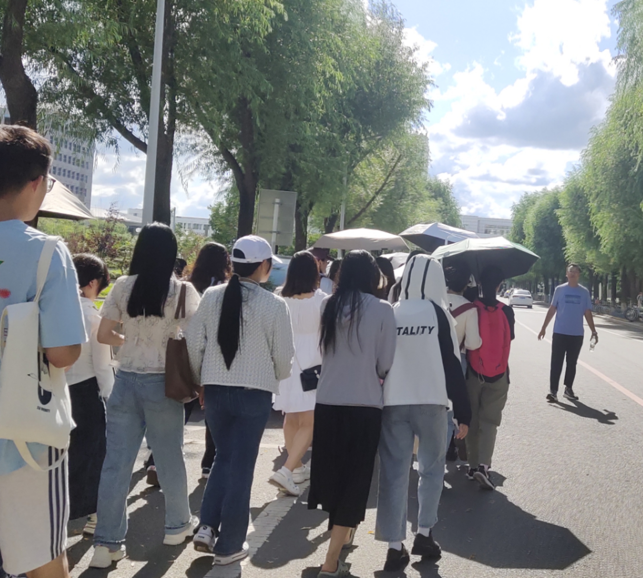林老师按照事先规划好的路线带领同学们参观并向同学们介绍学校的标志性建筑。新生游园队伍于北苑三公寓楼下小广场集合,途经鼎新楼、清湖、湖畔餐厅、日新楼、中心图书馆、逸夫楼及外语楼。在游园结束后,同学们在外语楼前留下了入校的第一张集体合影。