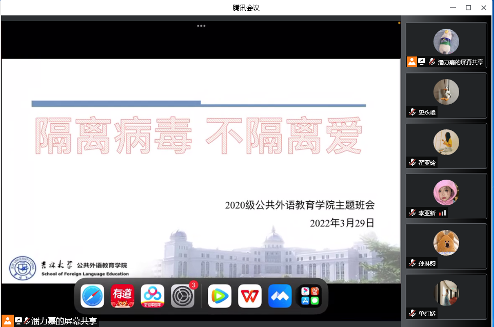 为进一步做好疫情防控宣传,提高同学们的疫情防控意识和自我安全意识,329日,公共外语教育学院2020级全体学生召开了以“隔离疫情·不隔离爱”为主题的班会活动。
