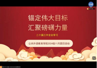 为深入学习和讨论党的二十届三中全会精神,增强奋斗意识,厚植爱国情怀,公共外语教育学院2023级、2024级团支部分别于2024年11月22日晚和11月26日晚开展了以“讴歌光辉历史,青年砥砺前行——二十届三中全会精神学习”为主题的团日活动,此次团日活动由各支部团支书主持、支部团员参与。活动主要围绕“追溯改革之路,照亮时代航向”、“聚焦三中全会,提取全会重点”、“领悟会议精神,青年着眼未来”、“做奋进的中国青年”四个方面进行。